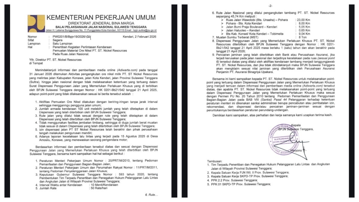 Kendari, Beritautamasultra.com – Balai Pelaksana Jalan Nasional (BPJN) Sulawesi Tenggara (Sultra) mengambil langkah tegas terhadap aktivitas pengangkutan material tambang di jalur publik. Melalui surat resmi tertanggal 2 Februari 2026, otoritas jalan nasional ini mengeluarkan instruksi penertiban terhadap kegiatan perlintasan kendaraan pemuatan material ore nikel milik PT ST Nickel Resources.