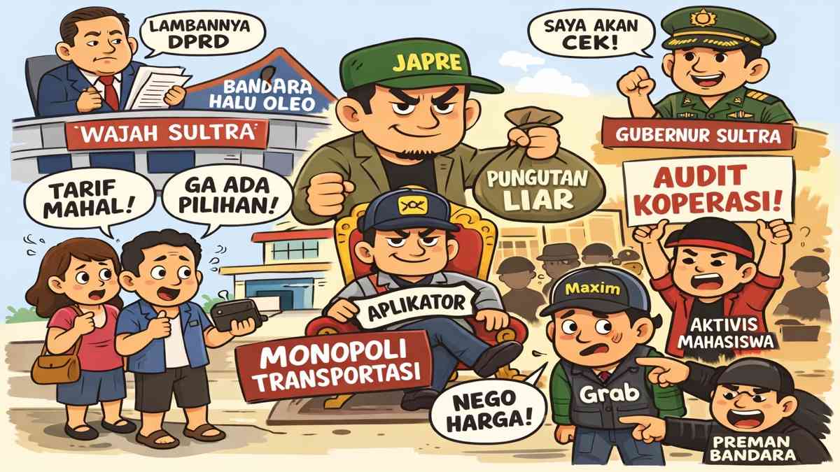 Kendari, Beritautamasultra.com – Citra Bandara Halu Oleo sebagai gerbang utama atau “wajah” Sulawesi Tenggara kini tengah dipertaruhkan. Rentetan keluhan mulai dari dugaan monopoli satu aplikator, tarif selangit, hingga isu “jatah preman” (japre) di lingkungan koperasi bandara memicu gelombang desakan dari berbagai aktivis hukum dan mahasiswa.